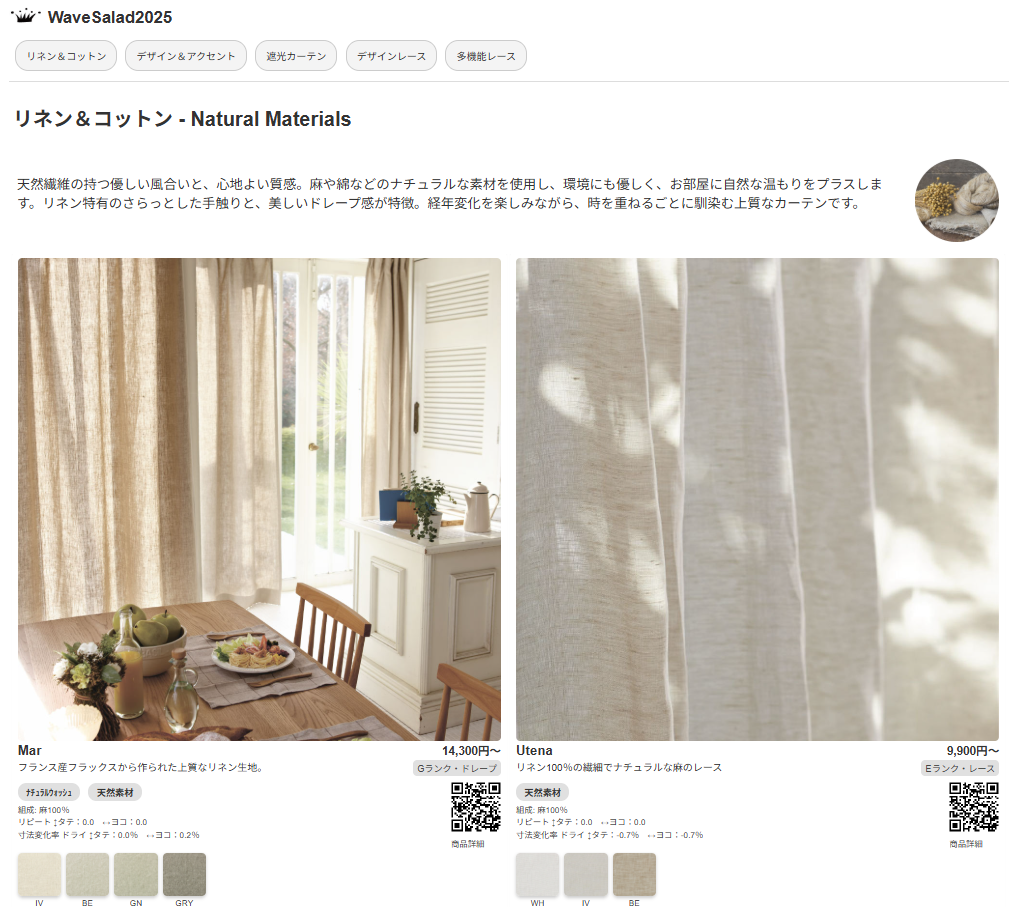 WAVE SALADのラインナップは、厚地130種類、レース70種類、全200種類から構成されています。